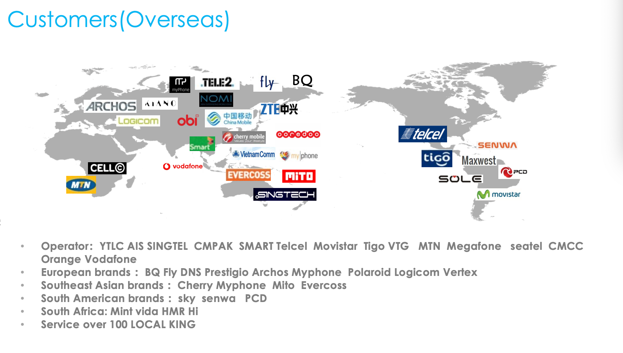 Our products are now available in more than 20 countries and regions worldwide, including Russia, Thailand, Malaysia, Vietnam, Singapore, India, Mexico, Argentina, Colombia, Turkey, Dubai, France, Germany, South Africa, Ethiopia, Kenya, Egypt, Tanzania, Papua New Guinea, Japan and Taiwan(china).