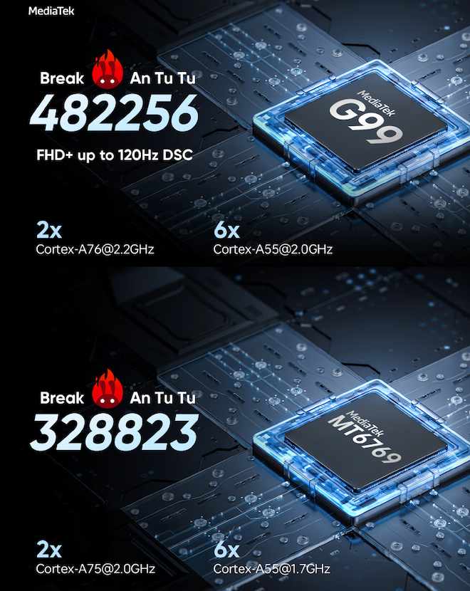 CPU:MT6789 2*A76@2.2Ghz+6*A55@2.0Ghz,6nm-Process, GPU Mali-G57MC2